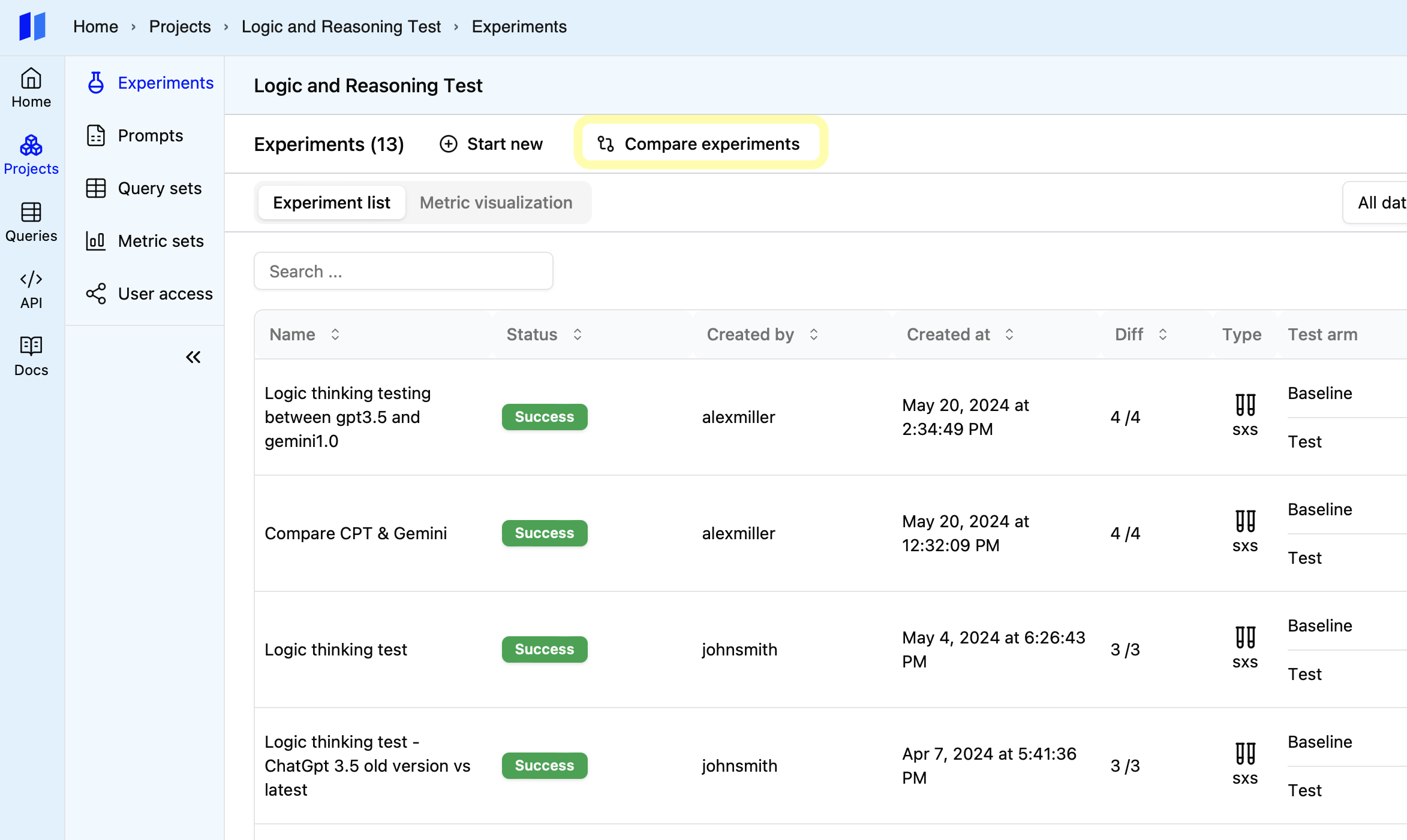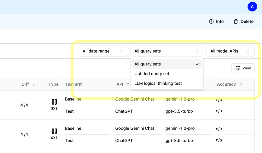 Navigate to the Experiment List Page and refine your view by applying filters based on criteria such as the specific query set utilized or the model API.