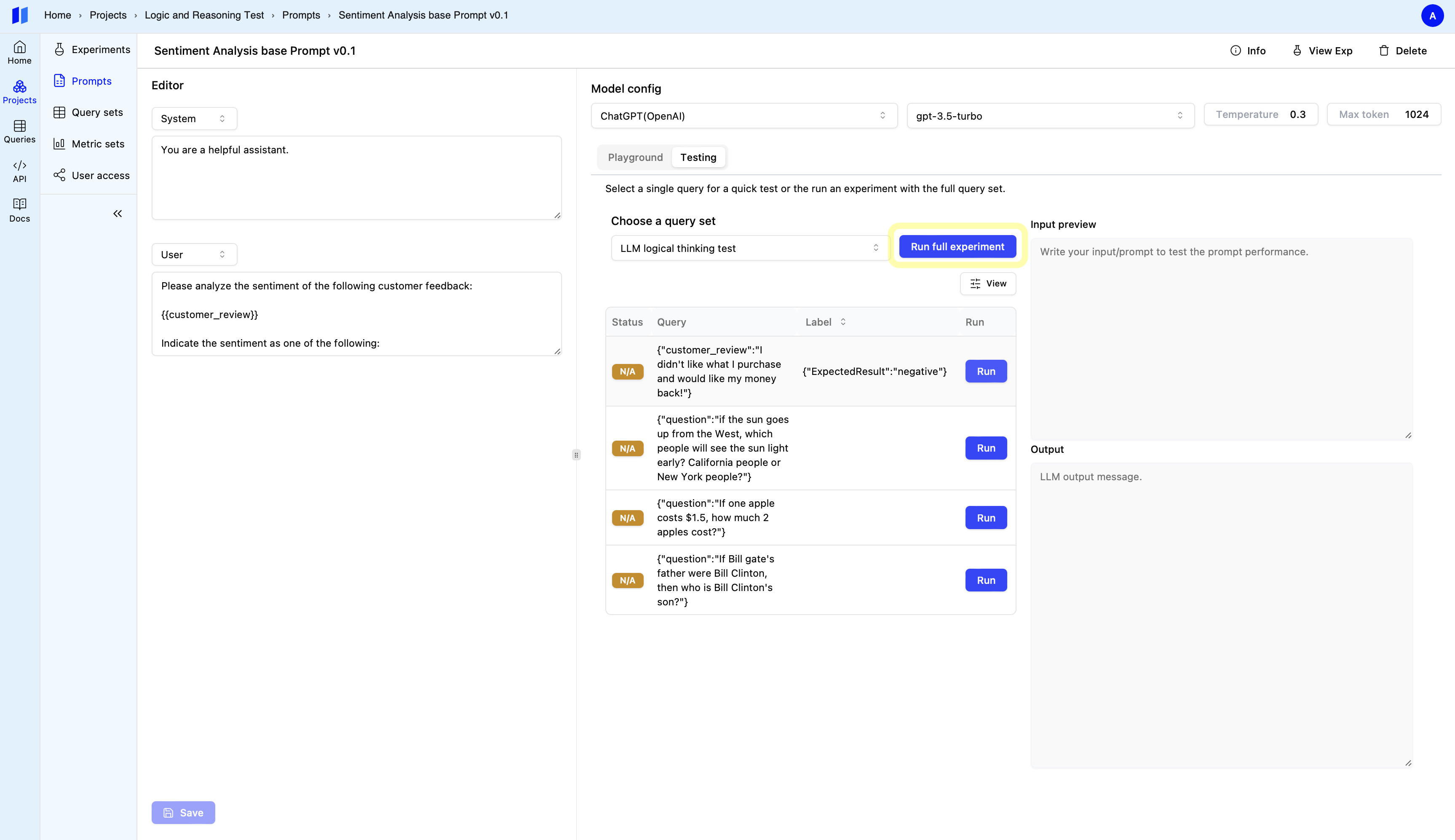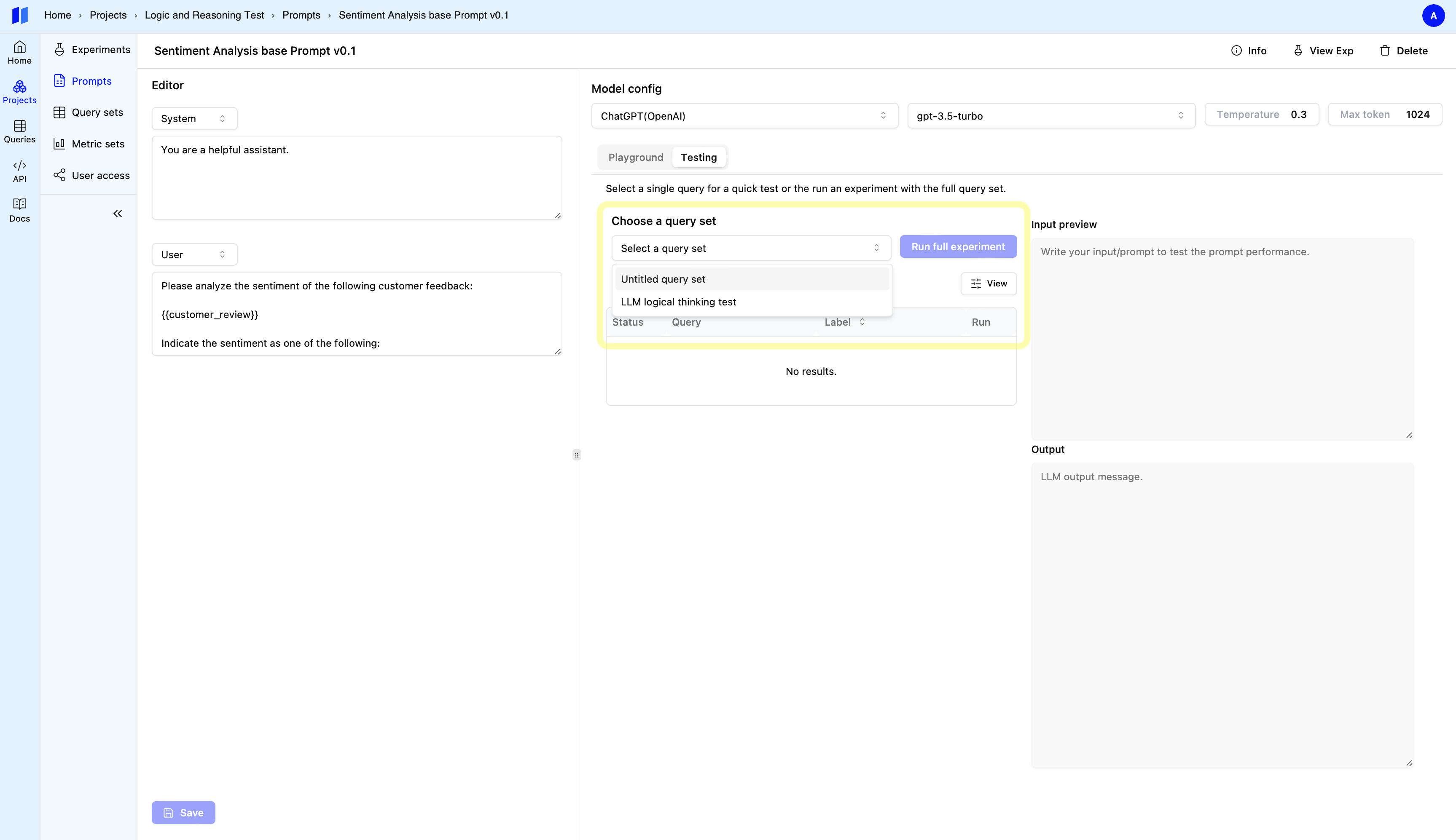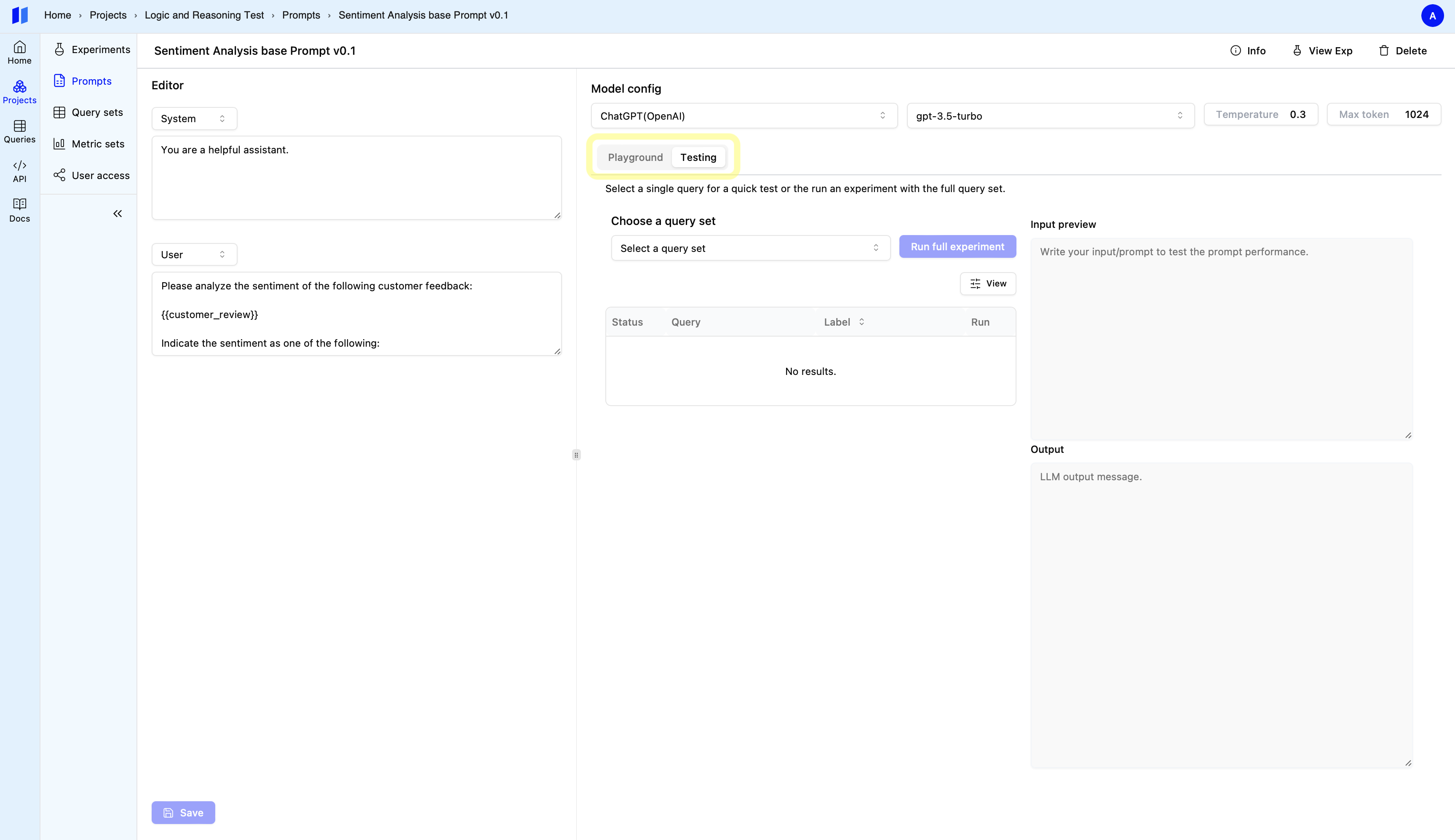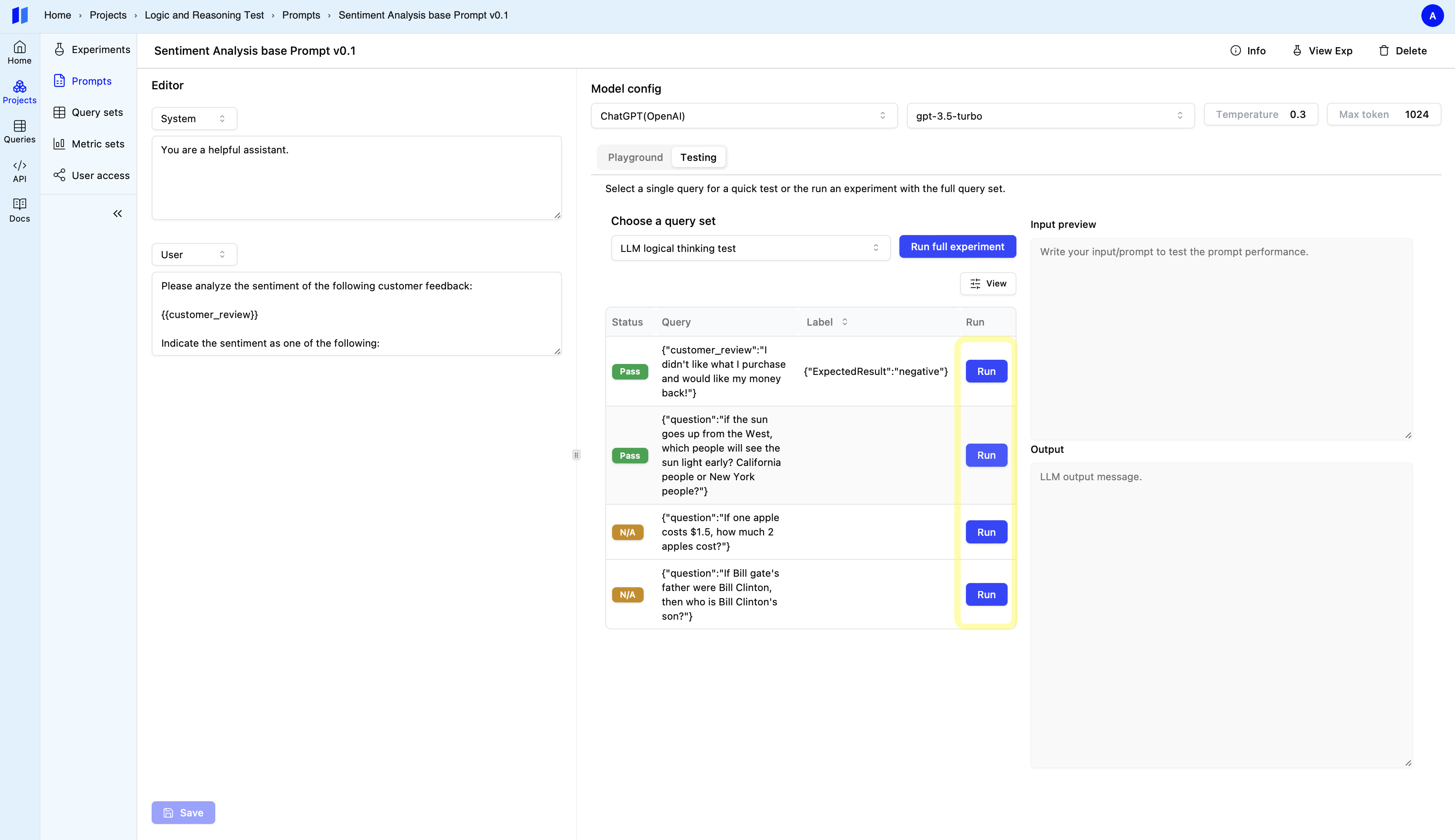 Single Test: To test your selected model and prompt, simply click the “Run”