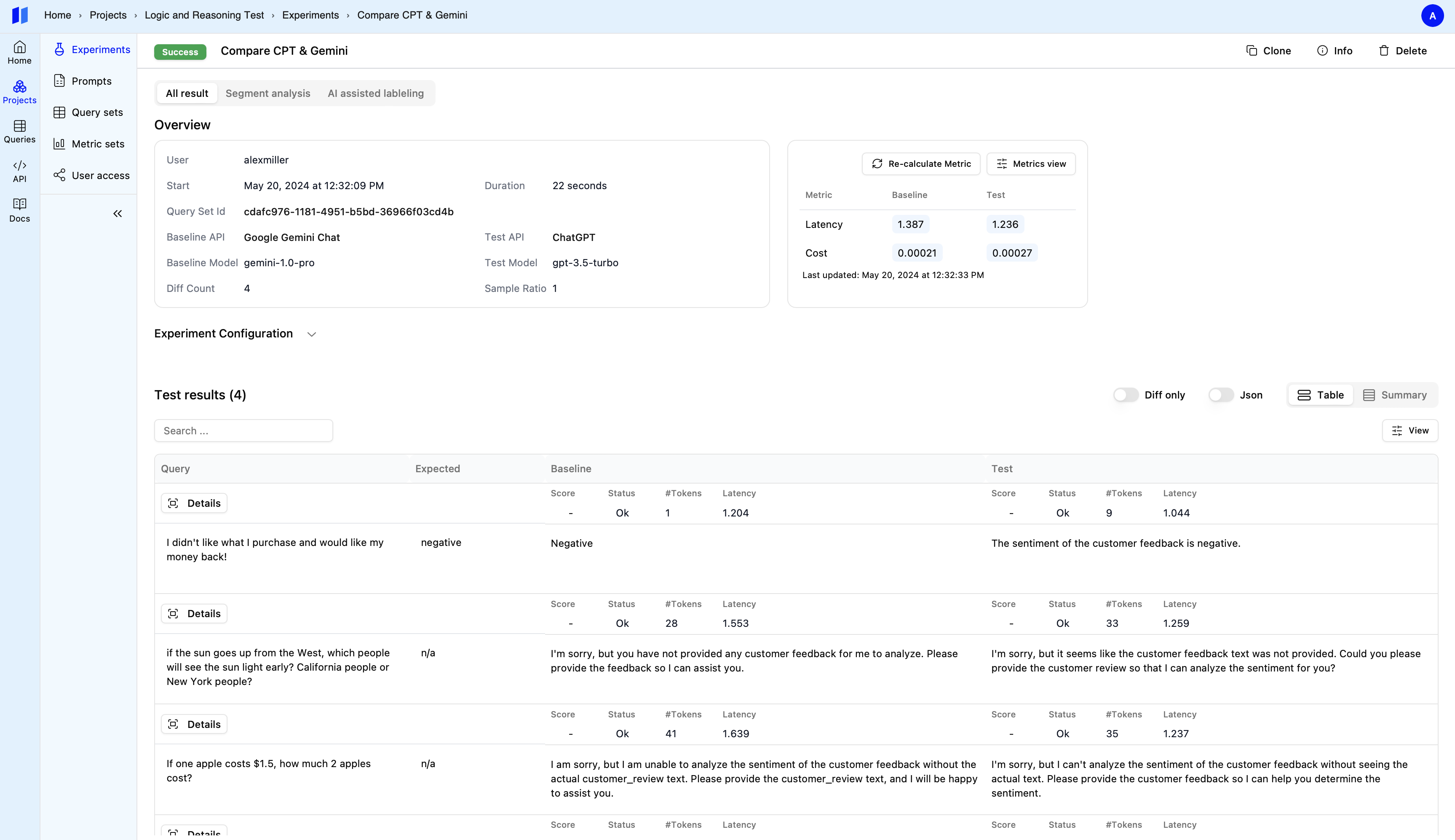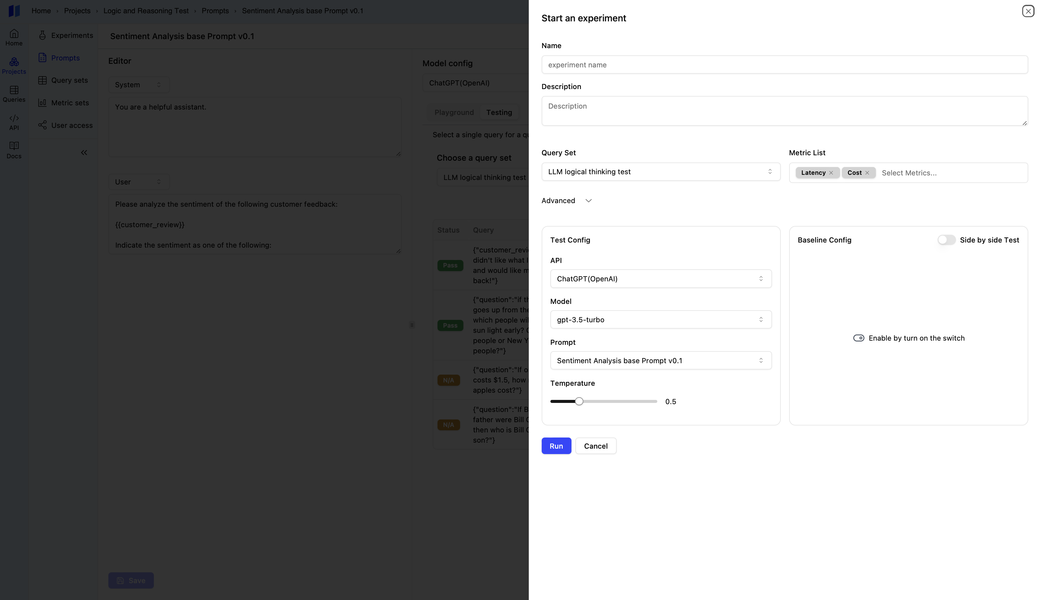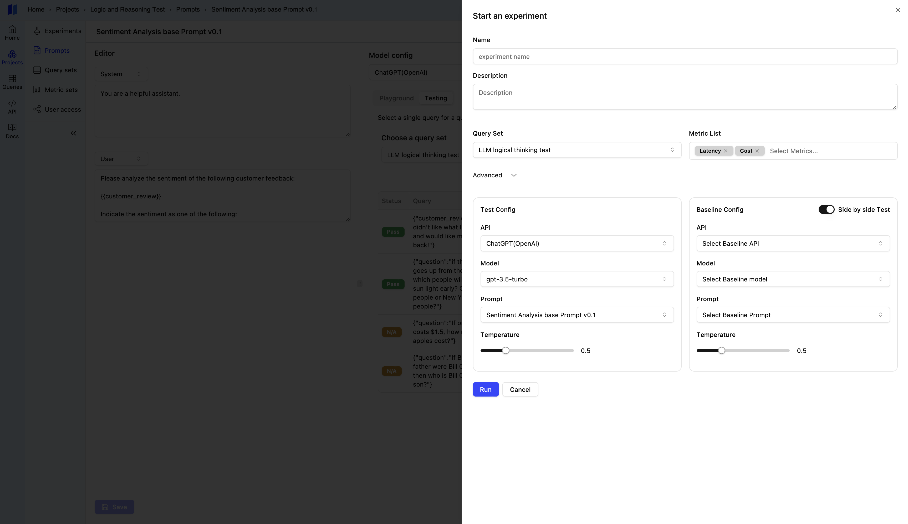 Side by Side Testswitch - Configure theBaseline Configsection. Choose an alternative AI model or prompt variation to compare against your primary configuration. - ClickRunto initiate the SxS experiment. A new experiment will be created and run in a separate tab, allowing you to compare the performance of your two configurations side-by-side.